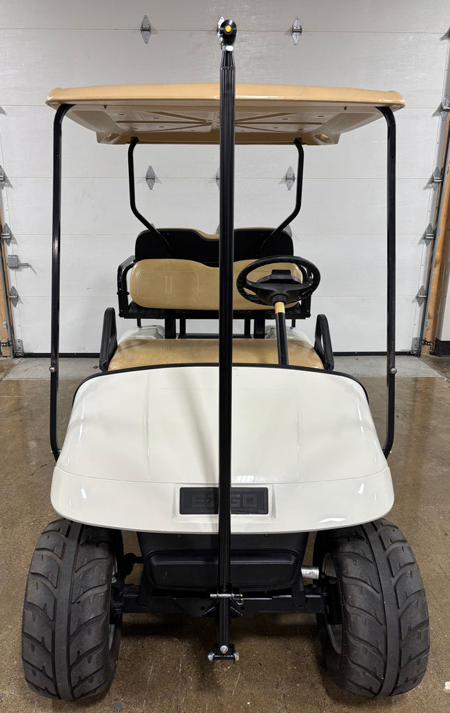 This folding push bar assembly is designed specifically for the 2001+ E-Z-GO TXT golf carts. It bolts directly onto the frame using factory holes and hardware for quick and easy installation. Works directly with our chassis side parachute mount but will also work with any other parachute mounts that has a 1/2" hole for pin connection. Includes powder coated push bar assembly with 60" push bar, hardware, 3/8" and 1/2" quick pins a 1/2" ID sleeve.