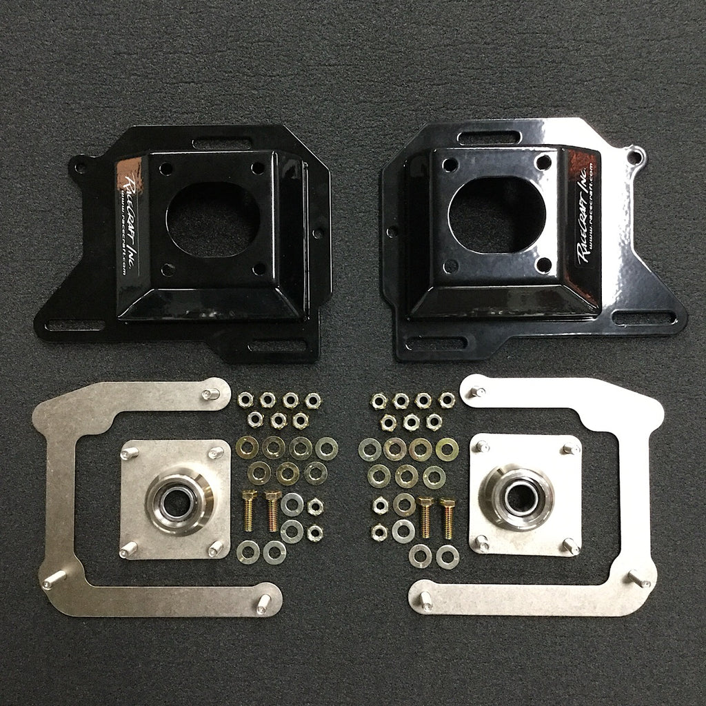 Racecraft Inc. 1982-1992 Camaro Steel Camber Plates replace the stock rubber strut mount bushings with a spherical bearing allowing you full control of the suspension geometry.Though this kit can be used with or without a coil over kit, it is designed with a coil over application in mind. Plate bodies have extra mounting locations and raised towers to accommodate the coil over kit with a 12" or 14" spring. Kit includes grade 8 hardware with Nickel plated and powder coated black finish. They allow for easy maximum caster and camber alignment. SOLD IN PAIRS.