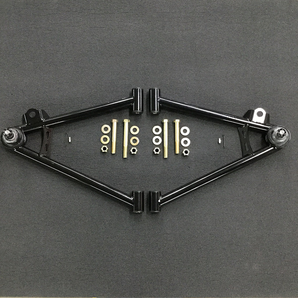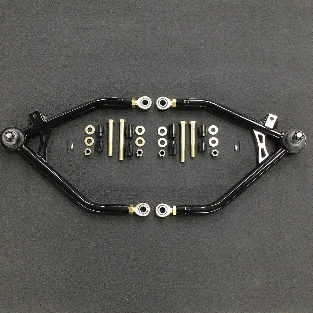 1982-1992 Racecraft Inc. Camaro Stock Length Bushing End A-Arms feature CNC machined ball joint cups, laser cut gusset, tab and 1-1/8" x .120 wall mild steel tubing. Racecraft Inc. tubular A-arms fixture assembled are 100% Mig welded and come with all grade 8 hardware to bolt them up to your K-member. All A-arms are powder coated gloss black and come fully assembled with high quality Ingalls ball joints.